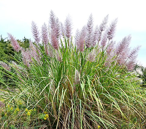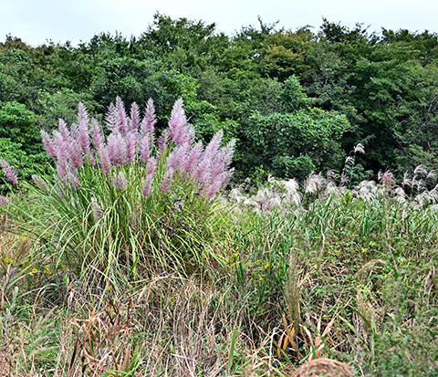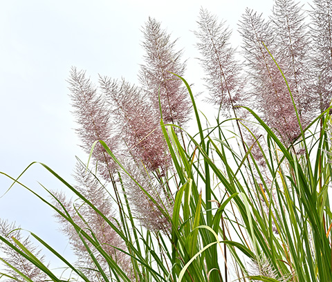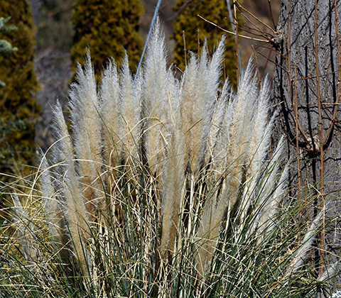 パンパスグラス(シロガネヨシ)でした。南米原産の大型のイネ科の植物で、公園や庭などに植栽されることもあります。南米の草原(パンパス)がその名につき、冬の穂の色から別名のシロガネヨシとも呼ばれます。遠目にはススキに似ていますが、ヨシやツルヨシ、ススキとは分類上異なるグループに属します。