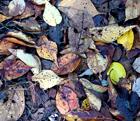 個人的には地面の落ち葉の紅葉がお気に入りです。博物館お隣の樹林地では、サクラやミズキが渋めの色合いで地面を彩っています。