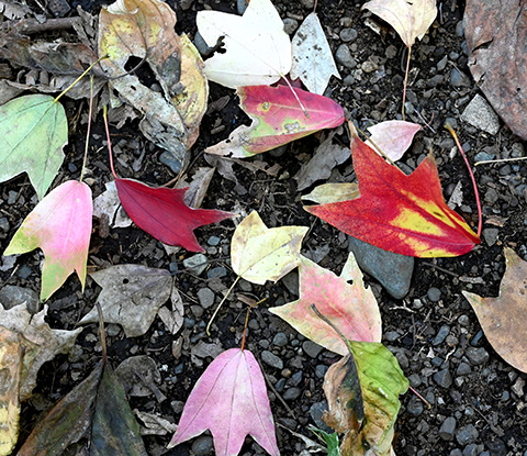 植栽木のトウカエデは、枝についた状態でも見事な紅葉を見せてくれますが、そちらはまだ半月以上先になりそうです。一足先に落葉した葉が見事に色づいています。