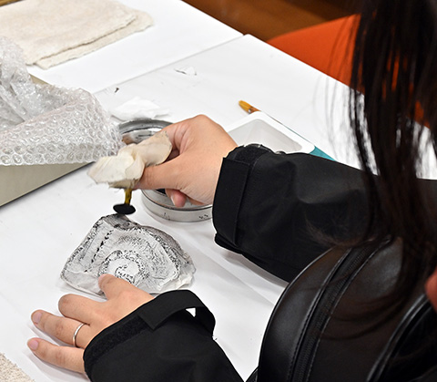 考古分野の縄文研究会は、「縄文土器の拓本体験」。本物の土器片を使って拓本を取る作業は、考古ファンだけでなく多くの方が楽しんでいました。