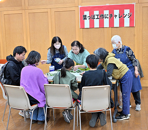 こちらは生物分野の相模原植物調査会による「葉っぱ工作にチャレンジ」。4種類ほどの葉っぱ工作に挑戦していただきました。
