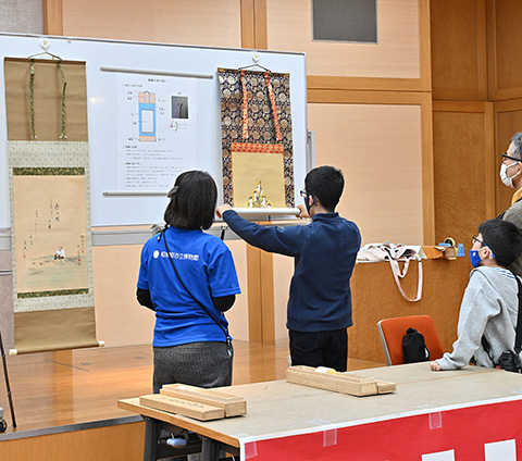歴史分野は「掛軸取扱体験」。こちらも本物の掛軸を使い、矢筈(やはず)を使って取り付けたり、巻いてもらったりしました。