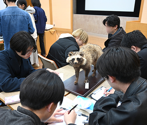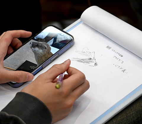 そして、その哺乳類の剥製(はくせい)を観察してスケッチをします。短い時間の中で足や顔などのパーツを選び、2種類以上スケッチして比較します。