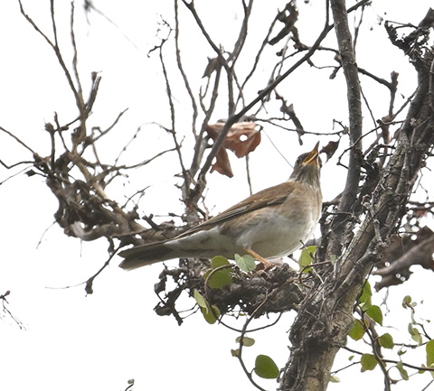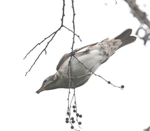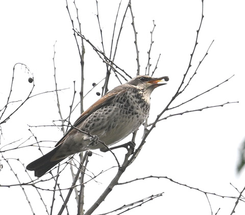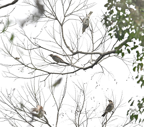 エノキに、ツグミが集まっていました。枝に残る果実を食べていたのですが、エノキの枝先は細いので、とまる場所が安定せず、入れ代わり立ち代わりとまっては食べています。