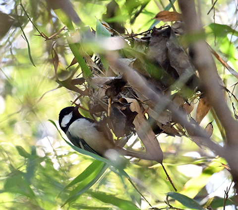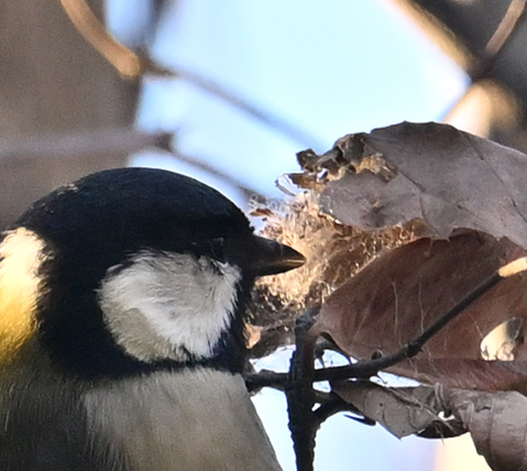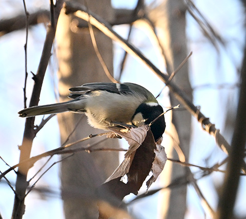 1月6日、博物館お隣の樹林地を歩いていると、シジュウカラの声がしました。ヤブの奥の方へ目を凝らすと、枯れた木の葉がまとまった場所がゆらゆらと揺れています。そこにシジュウカラがとまっていました。