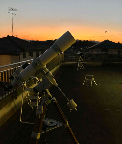 陽光台公民館2階テラスにて天体望遠鏡を設置