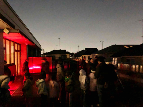 屋外では初めに、座学でもご紹介した「冬の大三角」を皆さんと一緒に肉眼で探してみました。その後、当館から持ち込んだ天体望遠鏡などを使い、いま見頃の惑星や、見つけやすい天体を次々と観望していきます。