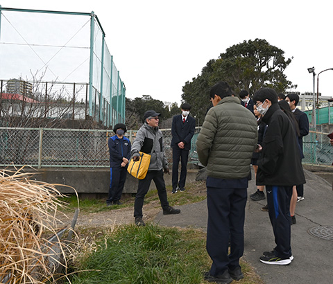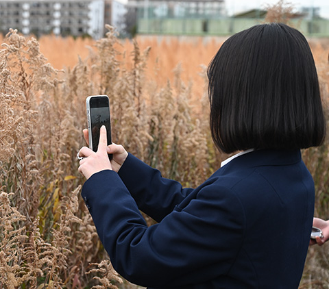 1月20日、県立座間高等学校で、生物多様性情報を蓄積するクラウドサイエンスに関する授業を実施しました。クラウドサイエンスというのは、インターネット上で生物などの情報を地図へ落とし、その情報をデータベース化していく、近年発展著しい市民科学の一分野です。今回は、その実践研究をされている麻布大学生命・環境科学部の村山史世教授と学生さんに技術的な面などサポートしていただきました。まず、室内でこうした生物多様性の基礎データについて少しお話した後、すぐに野外へ出ます。