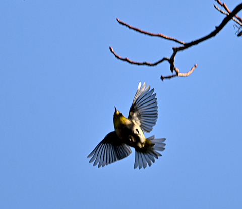 上空で小さな虫をフライングキャッチするメジロ