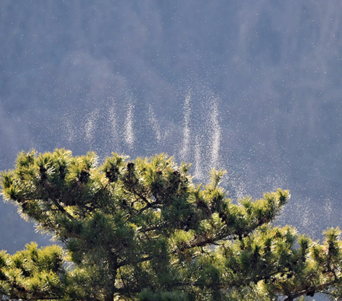 ふと河原のアカマツを見ると、煙のようなものが立ちのぼっています。
