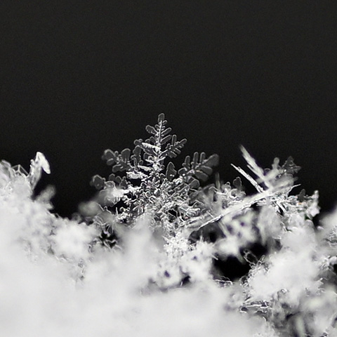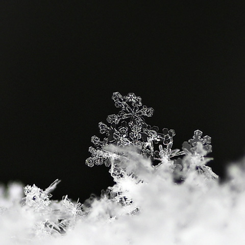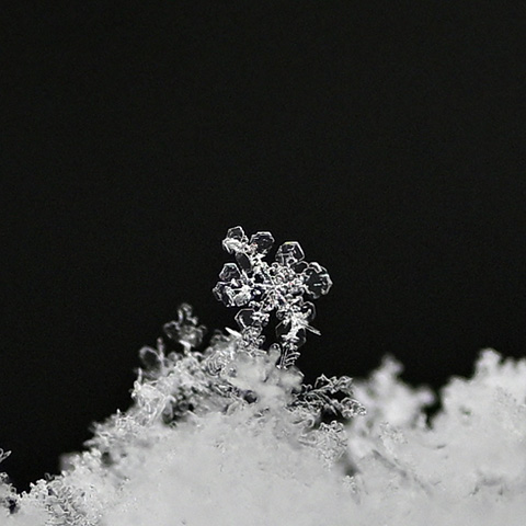 それほど気温が下がっていない中で降っている雪なので、結晶の多くは融けかかっていたり、くっつきあって崩れたりしています。運よく形が残っている結晶を探して撮影しました。ちなみに、背景は黒い傘です。