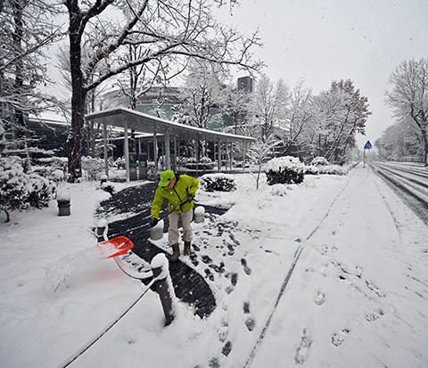 来館者の通路は雪かきをしてありますが、午前11時現在、まだ雪が降り続いています。