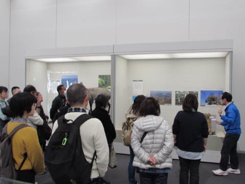 まず地質担当学芸員が、第1部「相模原の文化財」 プロローグ「相模原の文化を育んだ自然」のコーナーで、相模原の地形と地質について解説しました。