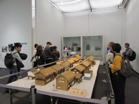 展示資料の小原宿絵図と、宿場のまちなみが再現されたジオラマを照らし合わせて説明しています。