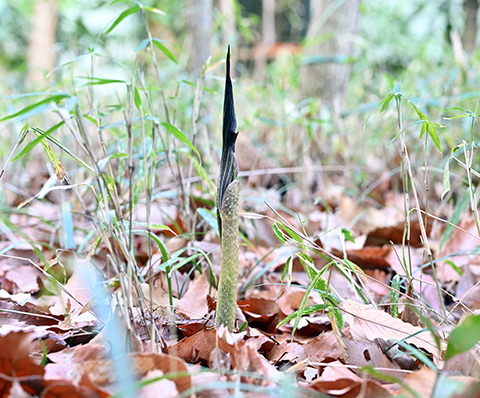 同じ仲間にはマムシグサという名前が付けられるものが多く、それは地面から出てきた茎の模様がマムシに似ているからと言われていますが、こちらも諸説あります。近くに芽を出したばかりの株があって、その様子を確かめられます。