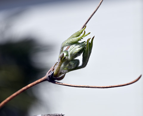 こちらは、つるから新芽が出てきたシロバナハンショウヅルです。お隣の樹林地の一画に自生する株から増やして駐車場のフェンスに絡ませています。
