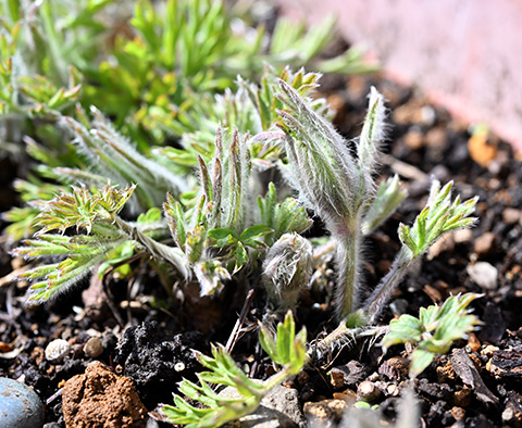 昨秋、季節外れに開花してしまって、翌春咲くのか心配していたオキナグサも、花芽が立ち上がってきました。