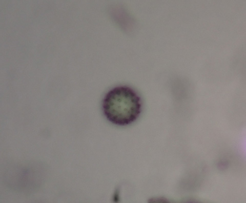 こちらは小さな花粉なので、かなり拡大しないとよく見えませんが、表面のトゲトゲは見えました