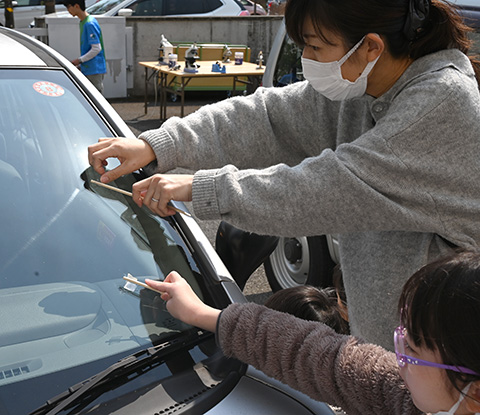 スギ花粉の採集場所は、公用車の駐車場です。フロントガラスなどに積もったスギ花粉を、セロハンテープに貼りつけます。
