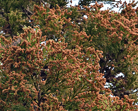 花と言えば、こちらも紹介せざるを得ません・・スギです。枝先の赤いところは、雄花や雌花が開花しているしるしです。