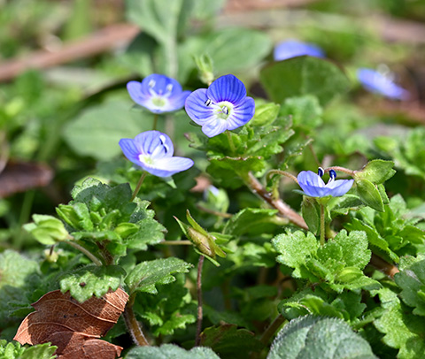 青系統の花色が続きますが、オオイヌノフグリです。日当たりの良い場所では冬の間から咲いていますが、この樹林地では春になってから咲きます。