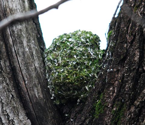 なぜこんなことをするのかというと、エナガの巣は、コケや地衣類などをこうした繊維で絡み合わせて球状の巣を作るからです。小さなか体のわりにソフトボールくらいの大きな巣を作り、中で10羽以上のヒナを育てます。