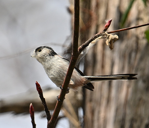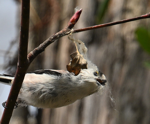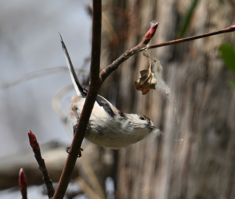 3月18日、お隣の樹林地を歩いているとエナガの声がしました。見上げると、樹上で妙な動きをしていました。