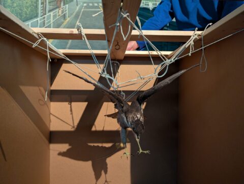 羽を大きく広げたツミの剥製は、展示ケース上部から吊り下げる形で展示されており、この状態を保ったまま運搬する必要があります。そのため、ワイヤーやタコ糸、結束バンドなどを駆使し、運搬時に揺れてもワイヤー類が資料に干渉しないよう注意しながら、天井部分を格子状に組んだ特別な運搬用段ボールのなかに収められました。