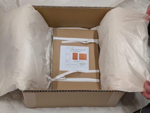 古文書資料は薄葉紙という薄手の紙で包んだ後、サイズを合わせた板段ボールでサンドイッチ状に固定し、ふかふかの緩衝材を敷いた運搬用段ボールに梱包します。
