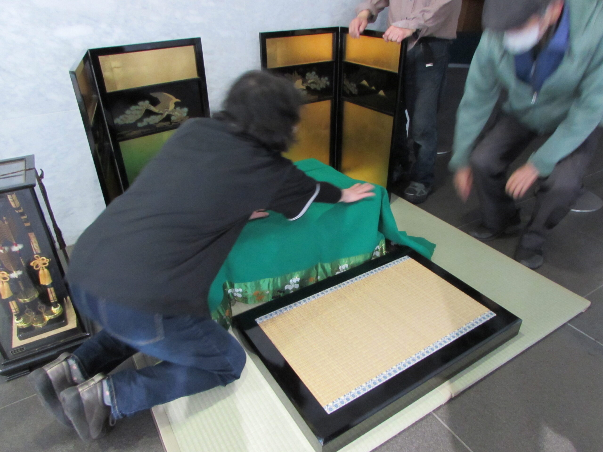台を設置し、緑の布を敷きます。