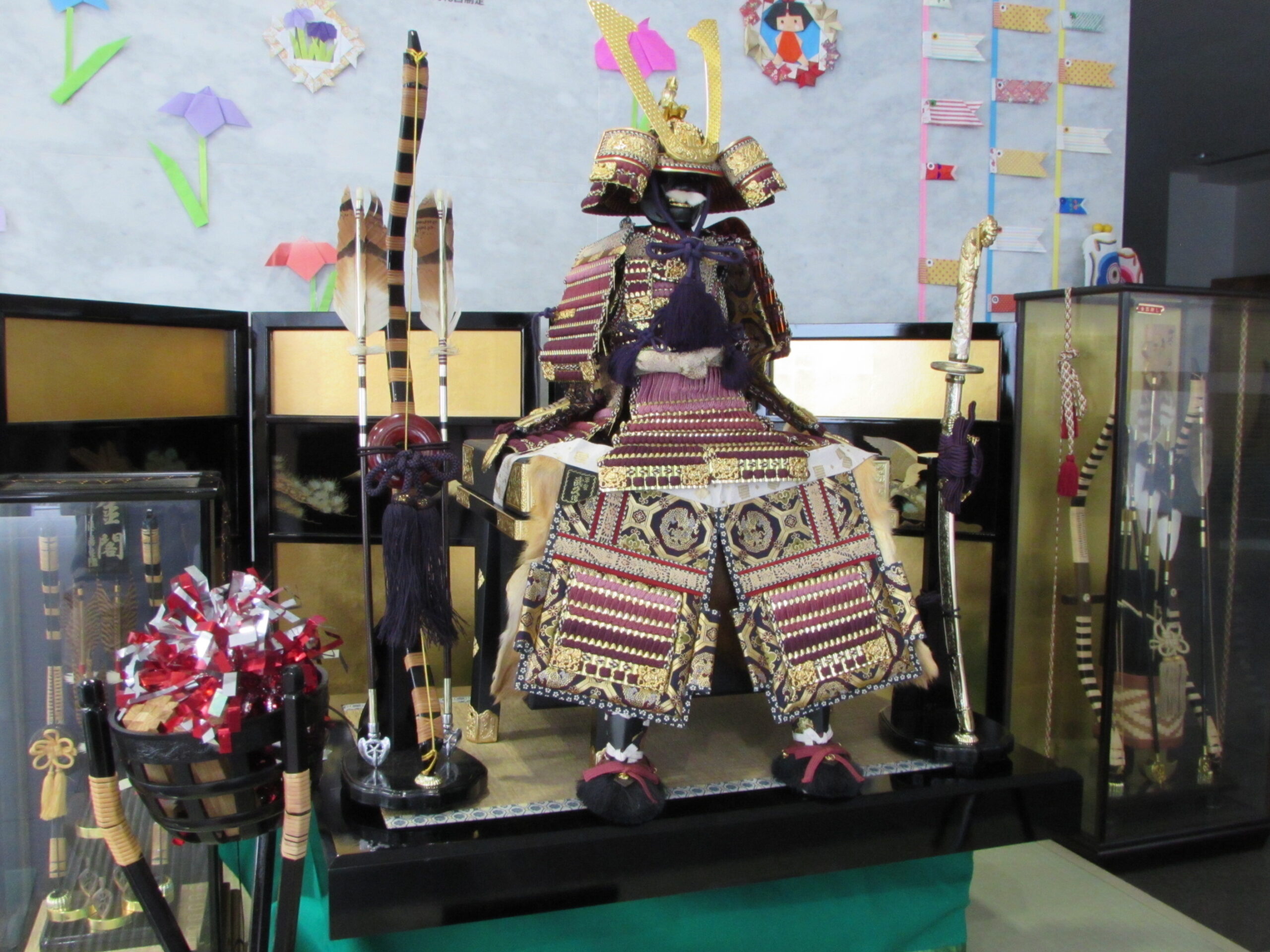 兜など鎧一式が置けたら、壁面の飾り付けです。