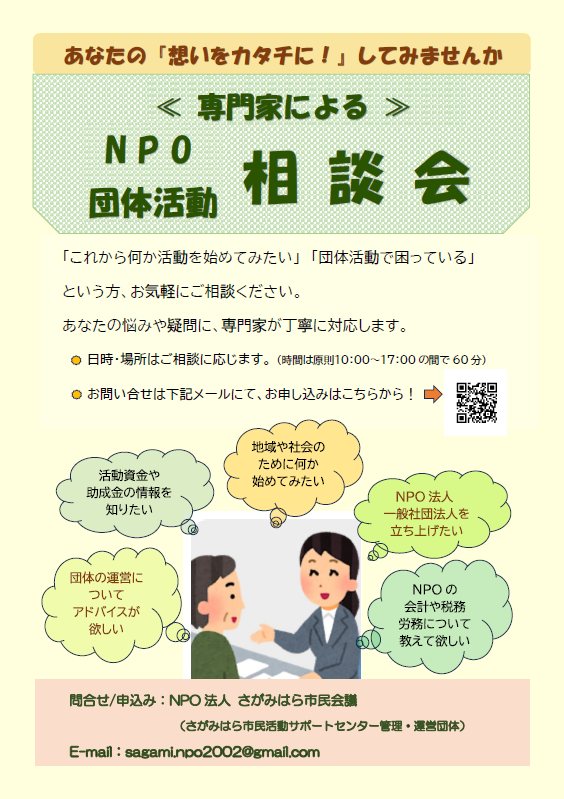 「 NPO法人さがみはら市民会議」主催の 新たな相談事業2件をご案内します。(2025/6/15)