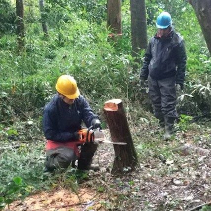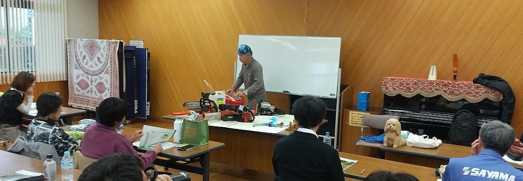 つちざわの森で3日間のチェーンソー講習会を行いました。森林整備に関心のある方々が14名来られましたが、9名が女性の参加でした。