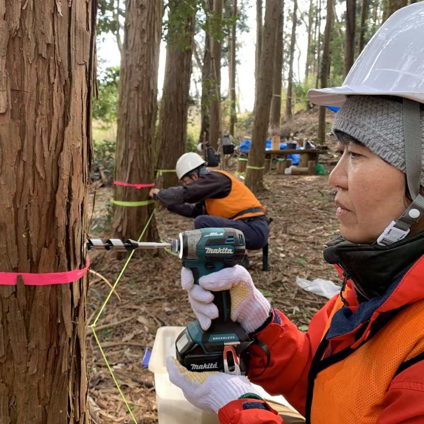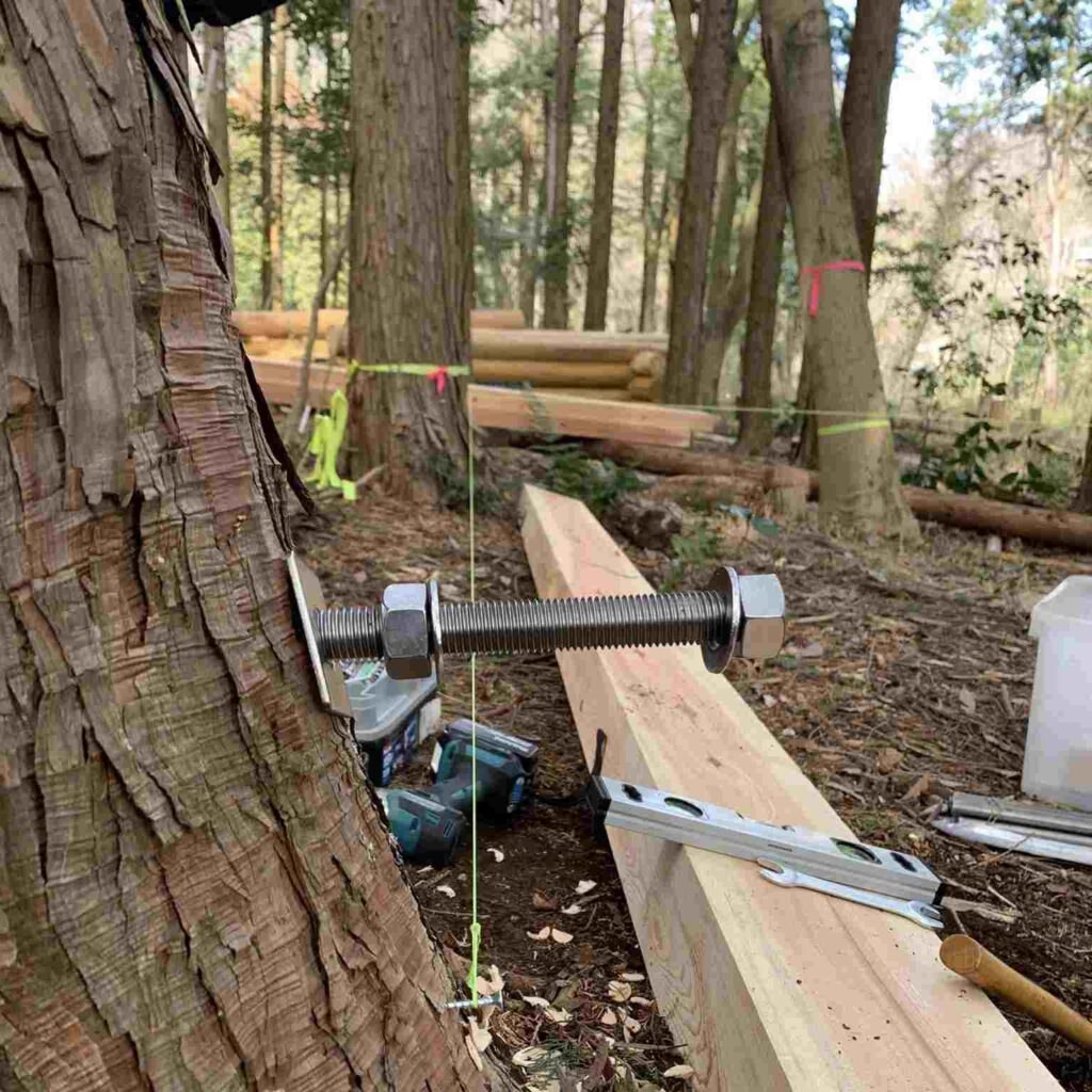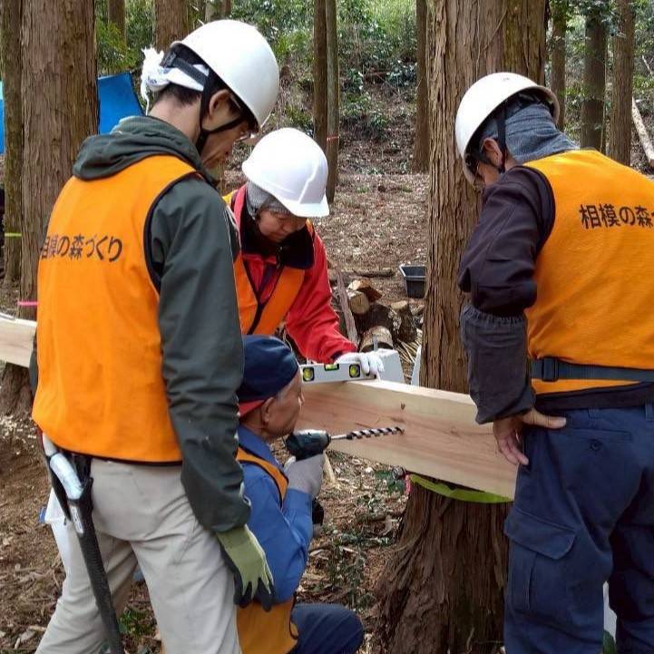 2月14日(土)定例活動 2026/02/25 Tweet Pocket ツリーデッキの梁材の取付を行いました。梁は樹木の成長を妨げないように離して2本のボルトで取付けました。ログデッキも並行して製作し、植林地の整備も進めました。
