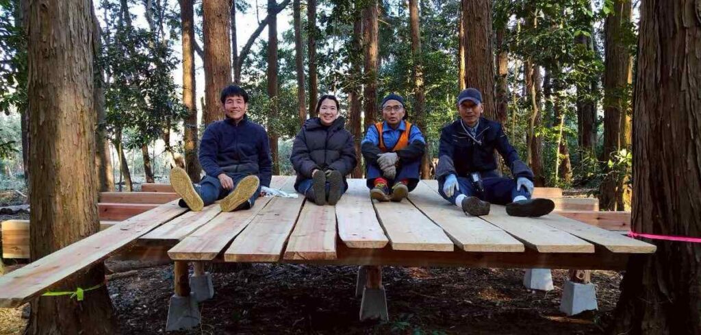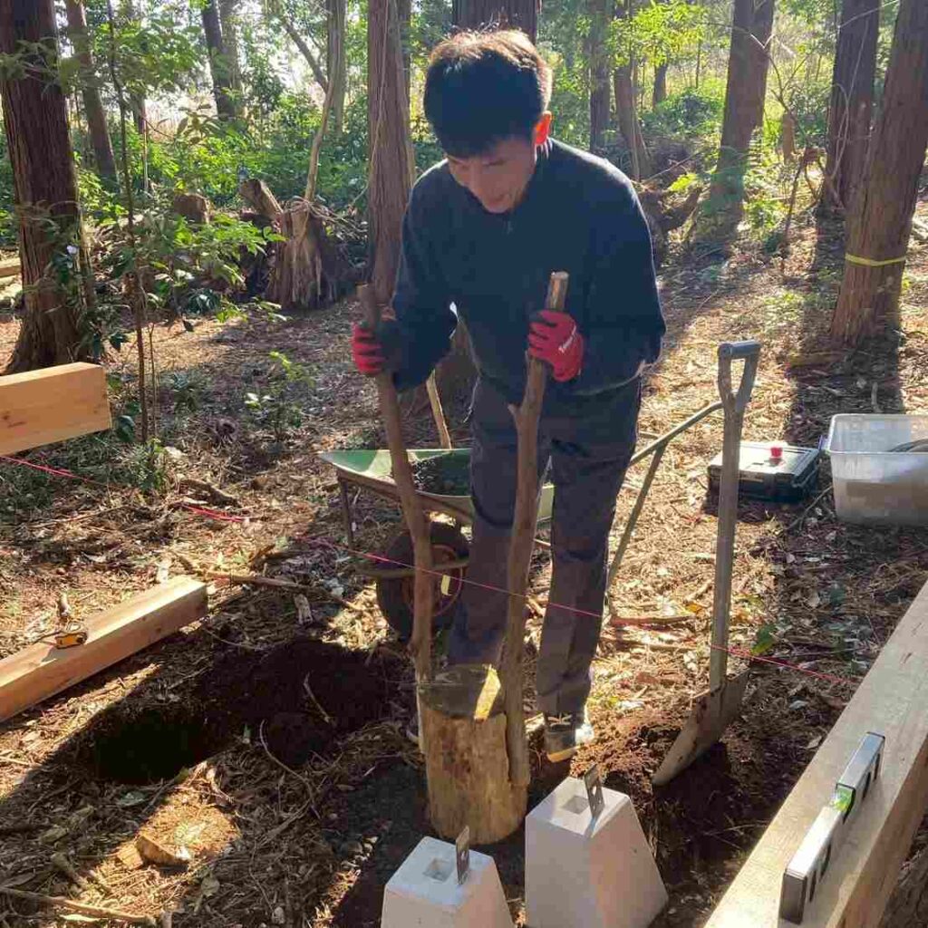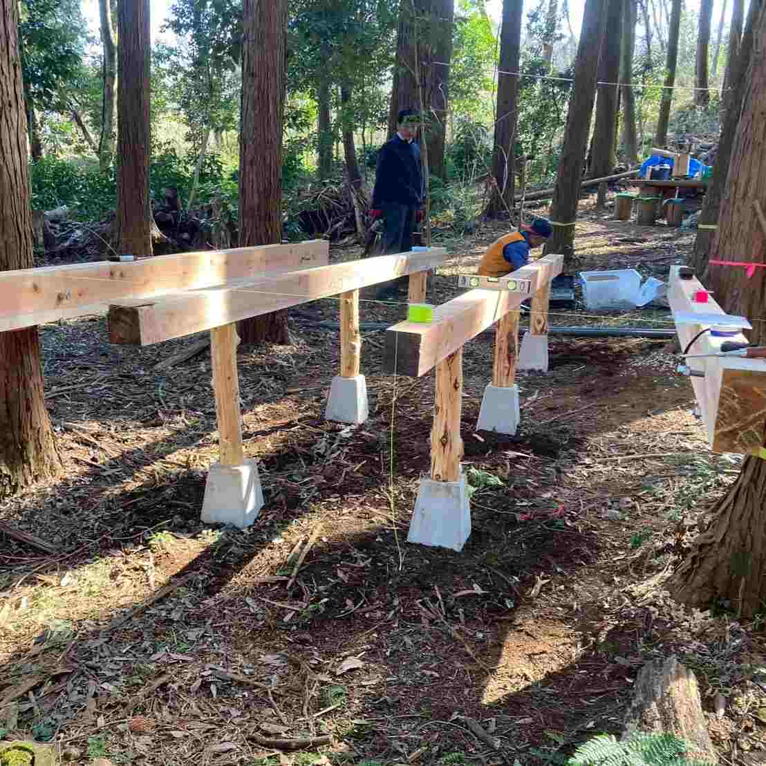 休日のため遅れていたツリーデッキづくりをしました。束と大引を設置して床板を仮敷きしました。