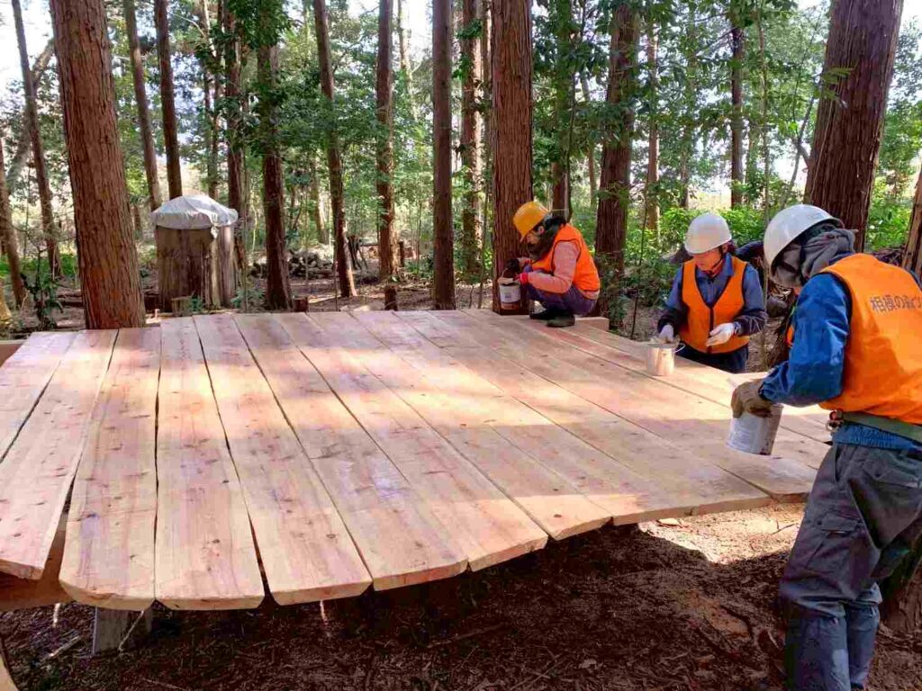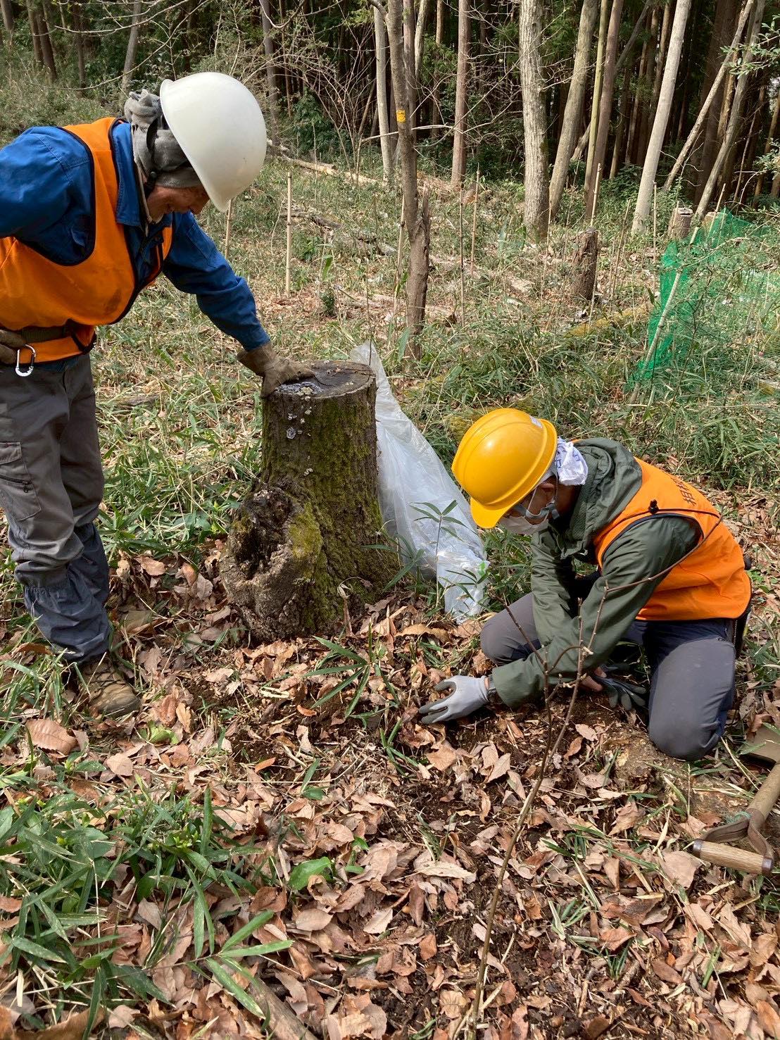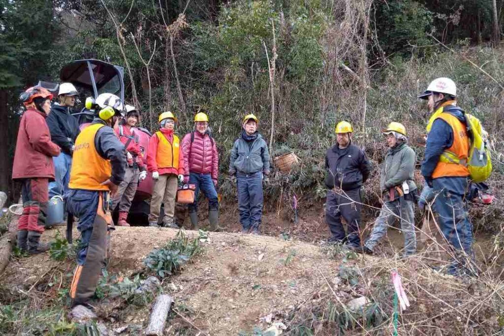3月22日(日)道づくり研修会・定例活動 2026/04/02 Tweet Pocket 自伐型林業の道づくりのレジェンドである岡橋先生に来て頂き、前回の研修会の続きで急斜面の道づくりを教えて頂きました。又、受講者にはユンボ体験も行いました。 定例活動日でもあったので、ツリーデッキの仕上とクヌギの幼樹と根が出始めたドングリの植栽も行いました。