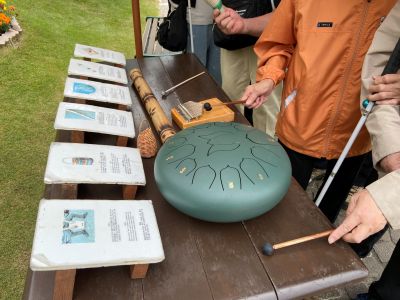3.音楽の森の美術館の庭園内、世界の打楽器に触れます。