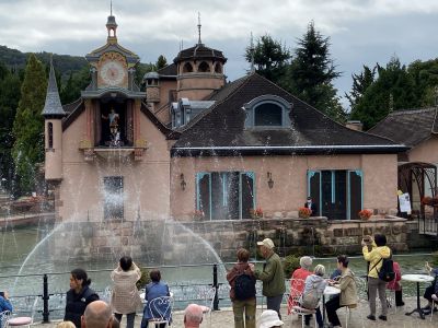 最初の見学地にも順調に到着し、河口湖森と音楽の美術館の見学では、雄大な富士山を臨む湖のほとりに佇む、中世ヨーロッパの貴族の館と町並みや、庭園に咲くバラなどの花々の香りを楽しみました。世界最大級のダンスオルガンやタイタニック号に搭載される予定だったオルゴールなどの自動演奏をホールにて観賞したり、オルガンホールでは生演奏も聞いたりしました。各世界のオルゴールなどの音色も聞く事ができました。メルヘンチックなショップで皆さん買い物なども楽しんでいるようすでした。