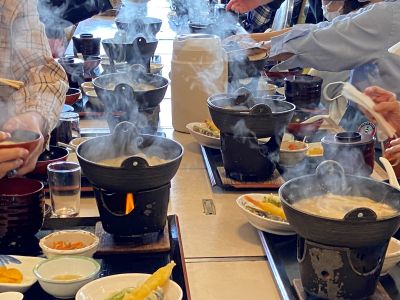 6.テーブルの上に並んだほうとうの鍋から湯気が上がっています。
