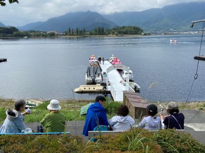 昼食は、河口湖の湖畔の気持ち良い空気の中で持参のお弁当を食べる方と、予約した方と分かれ、自由に昼食時間を過ごしました。