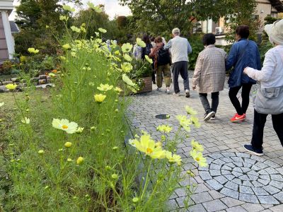 8.レモンイエローのコスモスが咲くハーブ庭園内の小径をみんなで歩いています。