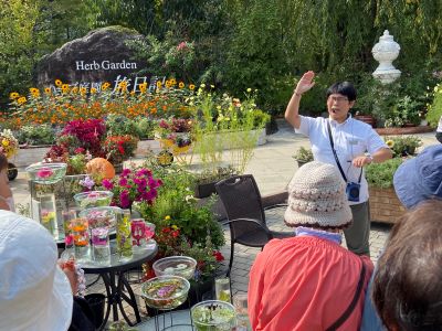 9.ハーブ庭園内の色とりどりの花々の前でスタッフの説明を聞きました。
