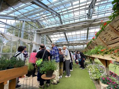10.温室の中、スタッフを囲んでローズゼラニウムの説明を聞いています。