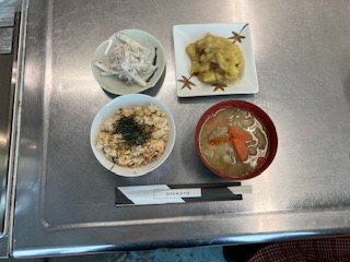 メニューは、鮭ご飯、豚汁、即席漬け、サツマイモとリンゴの甘煮、の4種類。