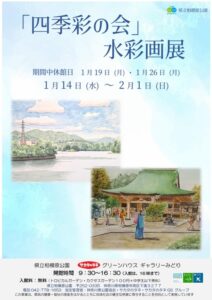 展示会開催 Tweet Pocket <展示会開催日が」決定しました> 会場 県立相模原公園内 サカタのタネグリーンハウス 展示ギャラリーみどり(2階) 会期 2026年(令和8年)1月14日(水)~2月1日(日) ーーーーーーーーーーーーーーーーーーーーーーー 過去の展示会作品(展示作品が参照できます) 2025年1月 展示ギャラリーみどり(相模原公園)水彩画展 2024年1月 第20回「総合学習センター」水彩画展 2023年8月 第18回「清流の里」水彩画展 2023年1月 第19回「総合学習センター」水彩画展 2022年8月 第17回「清流の里」水彩画展 2022年1月 第18回「総合学習センター」水彩画展 2021年11月 第16回「清流の里」水彩画展 2020年度 Web展示会 2019年10月 第15回 四季彩の会水彩画展(相模大野ギャラリー) 2018年10月 第14sikisainokai.jimdofree.com/2021年1月-web展示会/回 四季彩の会水彩画展(相模大野ギャラリー)