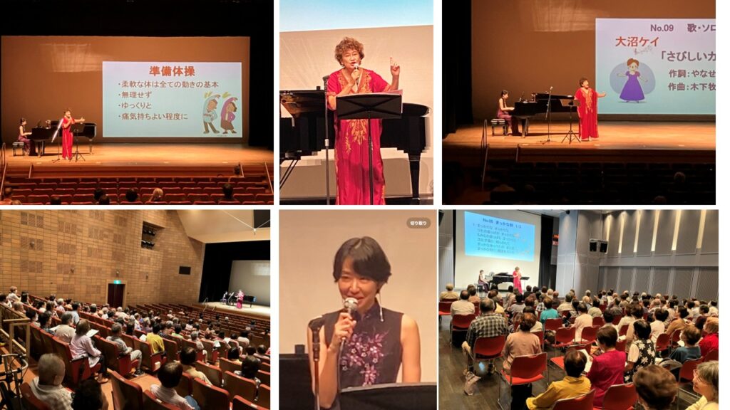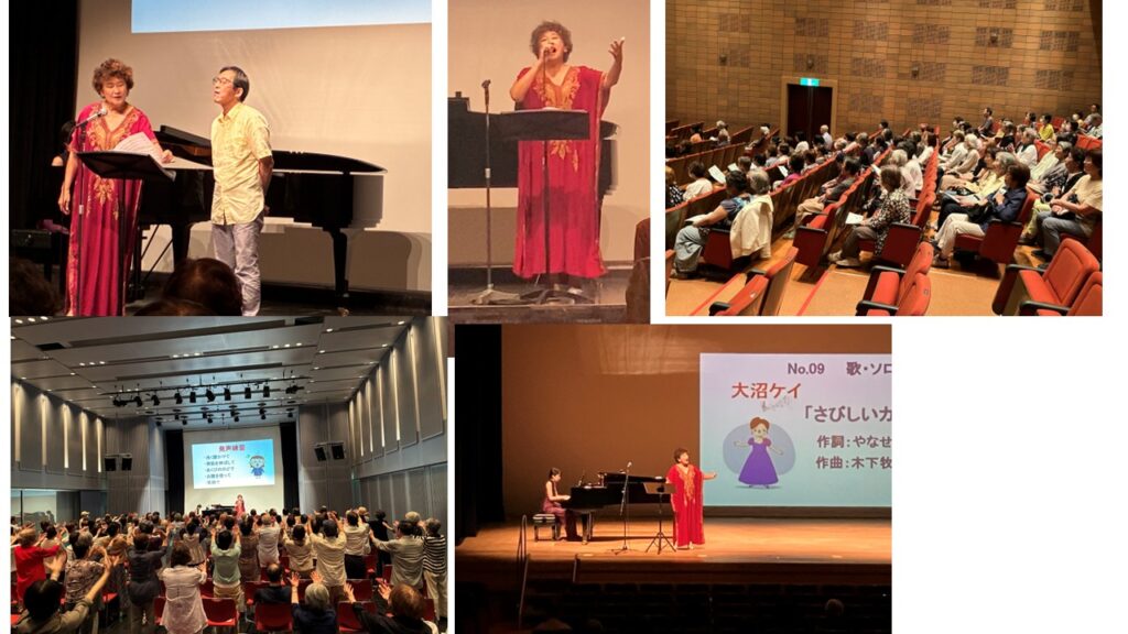 9月29日・30日、南市民ホール・杜のホールはしもとで開催されました。今年は夏の名残がいつまでも残り、酷暑の日々が続きましたが、9月末日ともなればようやく暑さも和らぎ、天候にも恵まれ、両日合わせて200名を超す方々が来場されました。初めて来場された方も多く、リードに合わせて声高らかに熱唱しました。今回は秋の歌が多く、間もなくやってくる秋の風情を思い起こしながらの歌唱となりました。