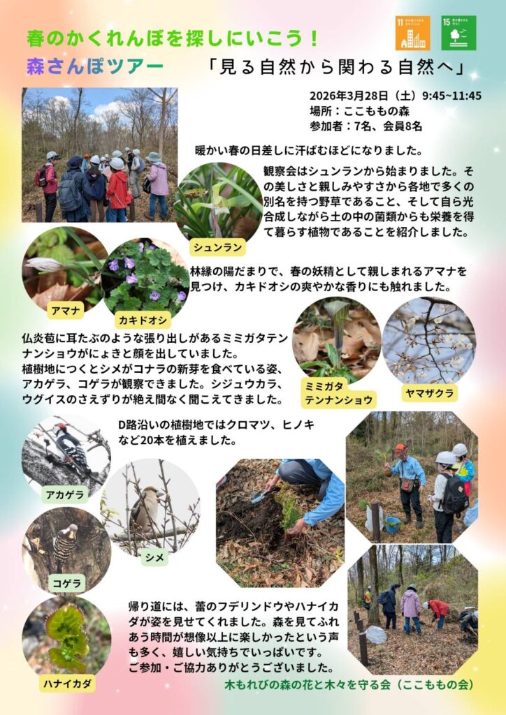 3/28春のかくれんぼを探しにいこう! 2026/03/22 Tweet Pocket 森を愛して欲しいので、なんでも目に入るのを、歩いて回ろうね!がこれからの世界にしたいと思って、実施することにしました。 開催結果のレポートを掲載しました。 今回は、植樹しました。無花粉ヒノキ、抵抗性クロマツ、モミ、カツラ、マメザクラ、マユミ、クヌギ、コナラなどです。巣箱は、残念ながら取り止めました。スプリングエフェメラルと呼ばれる春の先駆けの花が見られました。春の息吹を感じてください。 見る自然から、関わる自然へ