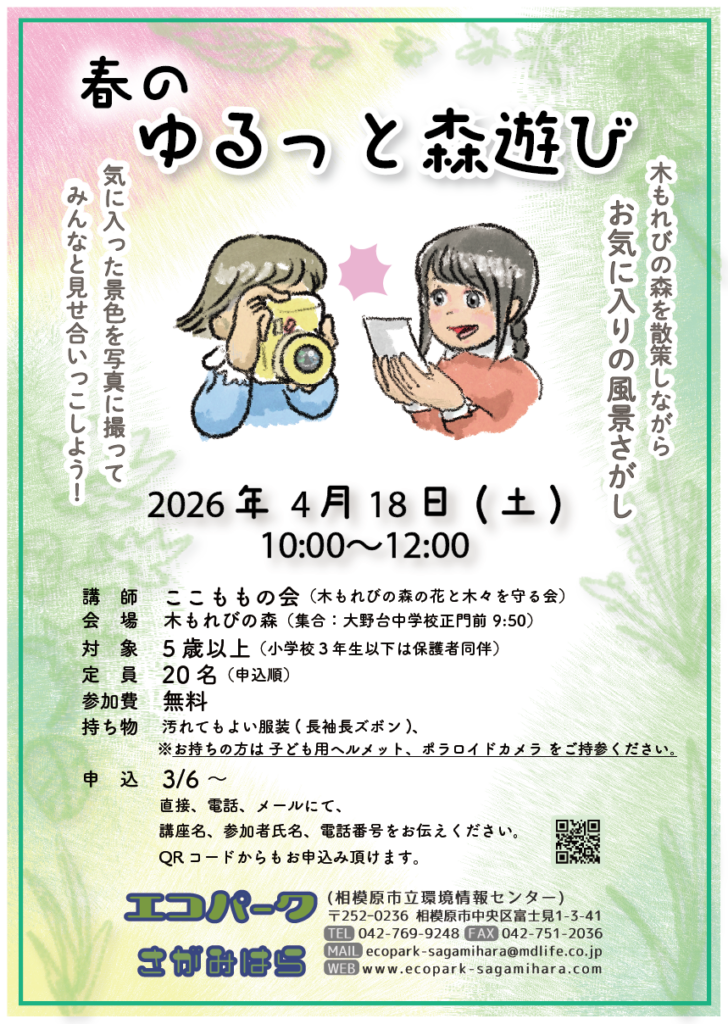 春をゆるっと森遊び 2026/04/01 Tweet Pocket 2026年4月の春を感じてみようと思うプログラムです。今年の春は駆け足。だからこれまでの春とは違う景色が見られるのではないか?小鳥たちは、どんな春を迎えるかな?子育てしているかな?花の芽吹きは、どこまで進むかな?ホタルカズラ(青い花)は、姿を見せてくるかな? 参加申込は、エコパークさがみはら様へお願いします。 こちらです お待ちしてますよ。