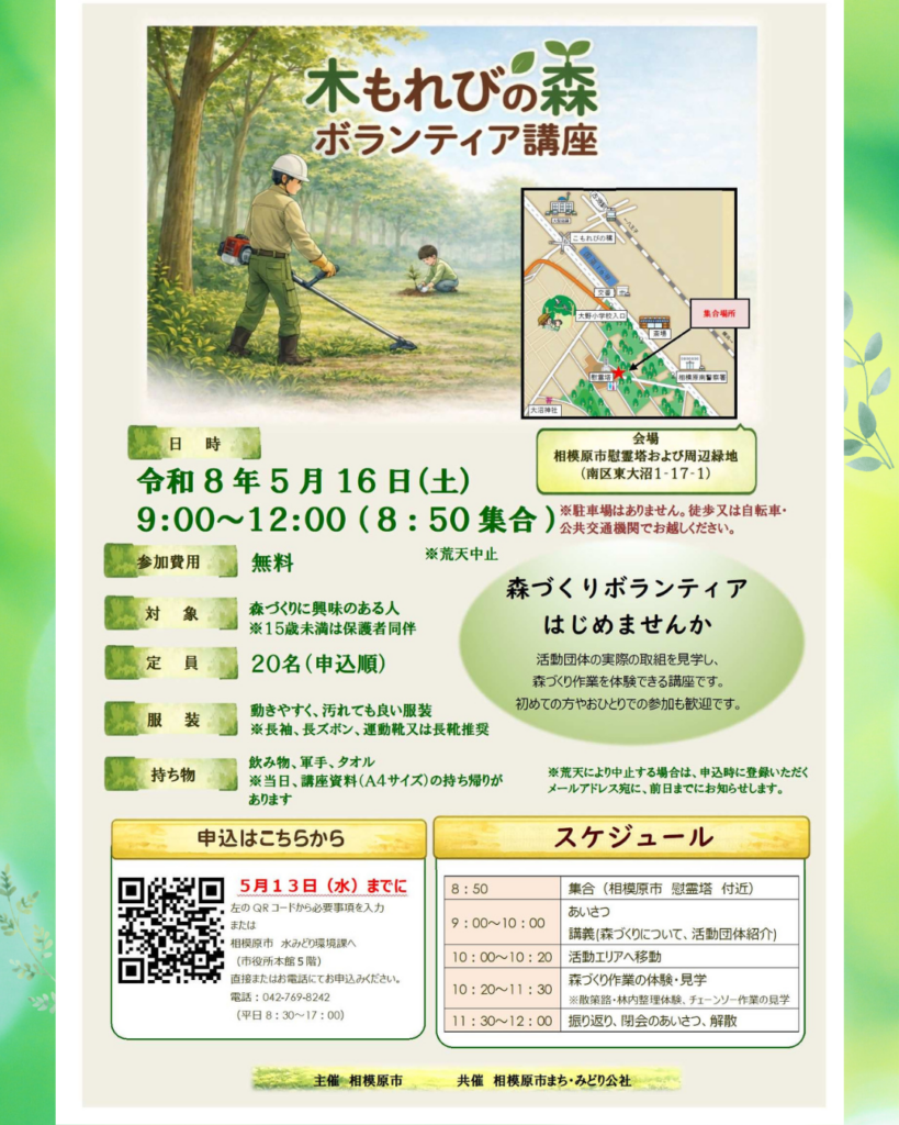 古淵駅前、国道16号線から徒歩25分のゴルフ場までの間に広がる森が、木もれびの森です。4団体のボランティアで活動しています。それぞれがアピールします。その後木を伐るなどの実際の作業を皆さんとします。