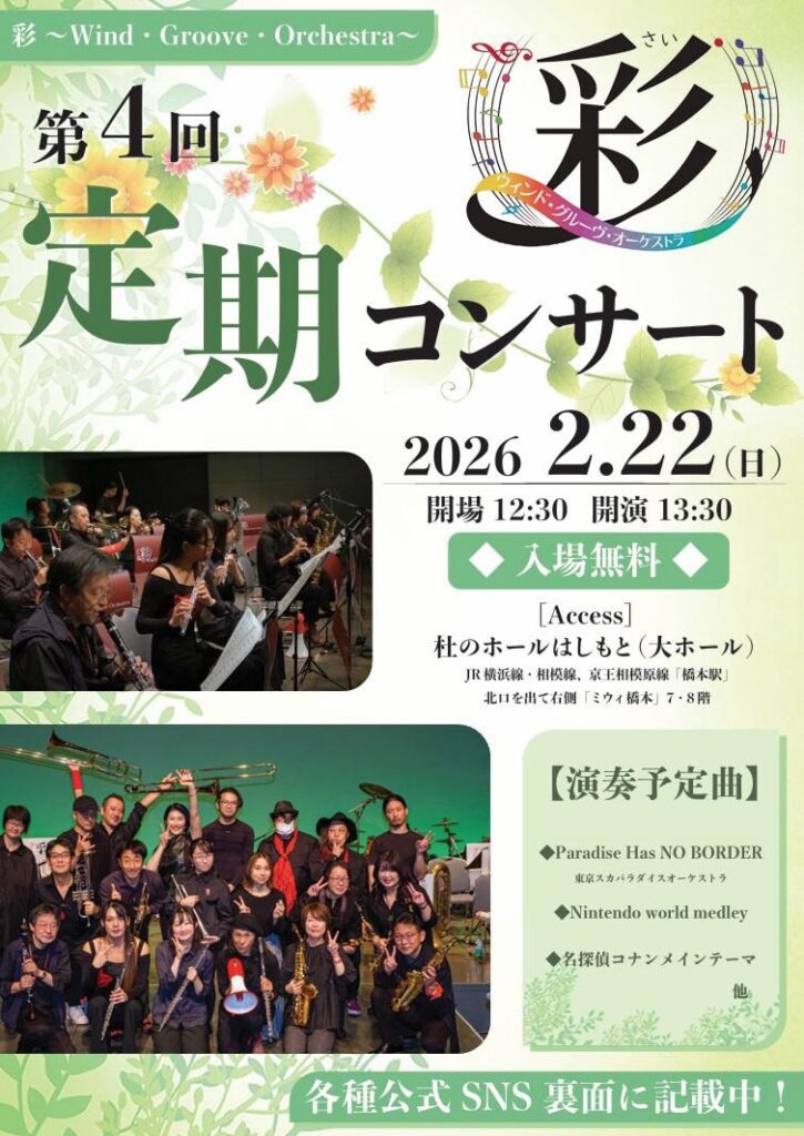 2026年2月22日(日)〜彩〜ウィンド・グルーヴ・オーケストラ~の無料コンサートが開催されます!当法人メンバーも出演予定です♪ぜひご参加ください。